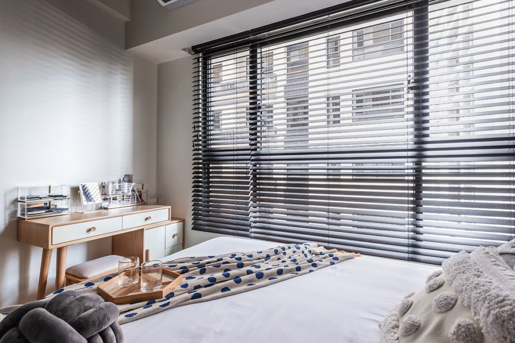Rèm lá dọc hoặc rèm sáo gỗ giúp tận dụng ánh sáng tự nhiên, dễ mở rộng không gian và điều tiết ánh sáng trong ngày.
